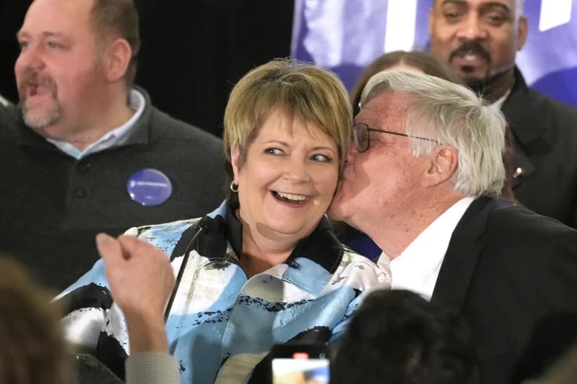 Supreme Court candidate Janet Protasiewicz gets a kiss from her husband Greg Sell while speaking at her election night watch party in Milwaukee, Wis., on Tuesday, April 4, 2023.