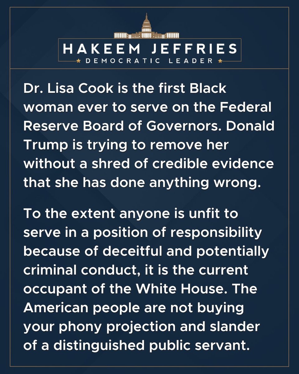 Abbe Lowell, who is representing Lisa Cook, says, “President Trump has no authority to remove Federal Reserve Governor Lisa Cook. His attempt to fire her, based solely on a referral letter, lacks any factual or legal basis. We will be filing a lawsuit challenging this illegal…