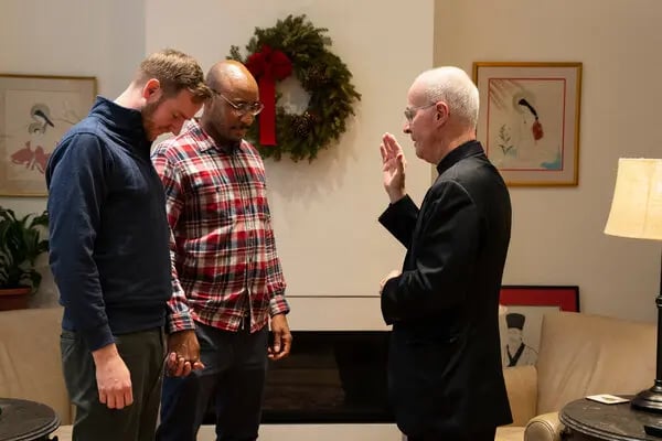 The Rev. James Martin gives a blessing to Jason Steidl Jack, left, and his husband Damian Steidl Jack, center, in Manhattan