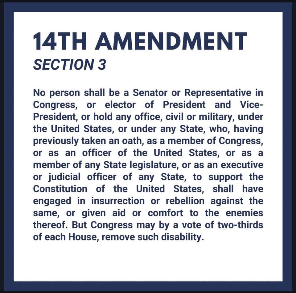 “No person shall…hold any office, civil or military, under the United States, or under any State, who…shall have engaged in insurrection or rebellion against the same, or given aid or comfort to the enemies thereof.”