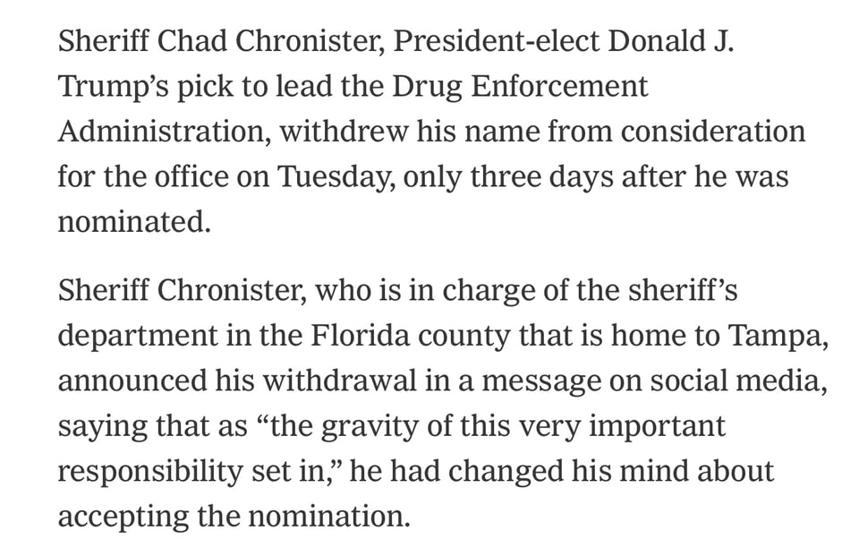 Chad Chronister, a Florida sheriff whom President-elect Donald J. Trump had chosen only a few days ago to run the Drug Enforcement Administration, said in a social media post on Tuesday that he was taking himself out of consideration for the role. “Over the past several days, as the gravity of this very important responsibility set in, I’ve concluded that I must respectfully withdraw,” he wrote. He added that there was “more work to be done for the citizens of Hillsborough County and a lot of initiatives I am committed to fulfilling.” (New York Times).