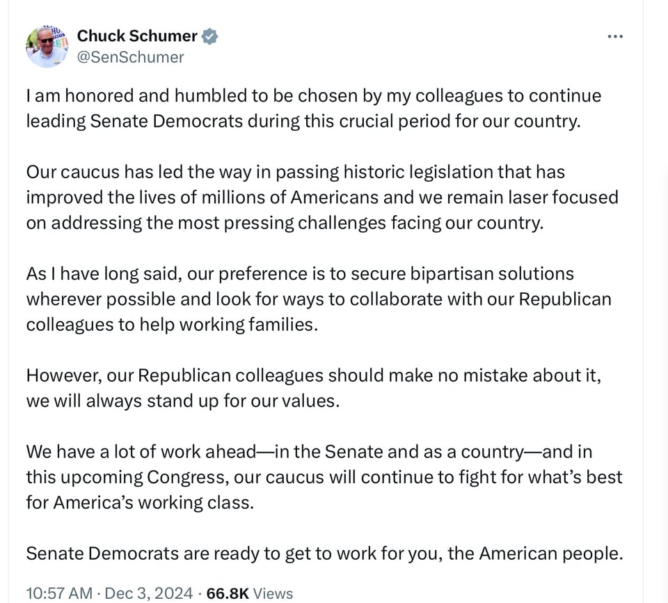 — Chuck Schumer (@SenSchumer) December 3, 2024