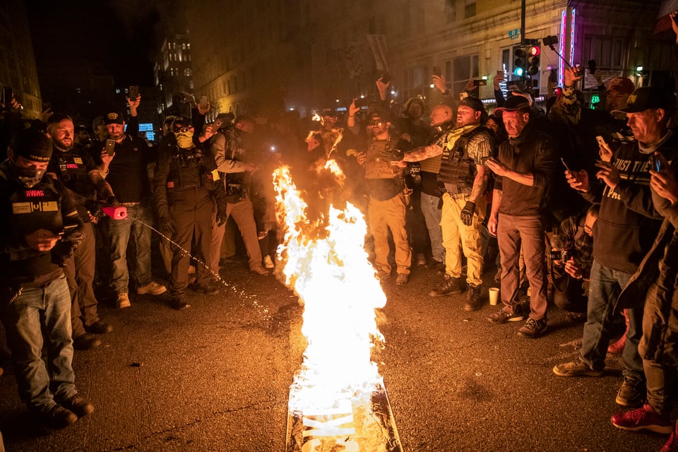On the night the banner was burned, another Proud Boys leader, Jeremy Bertino, was stabbed on the street during a clash with leftist counterprotesters.