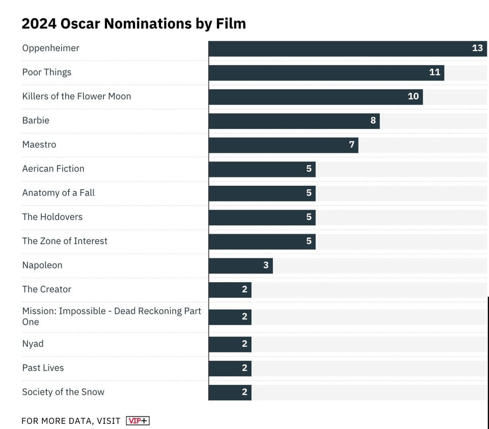“Barbie made $1.4 billion and was a cultural phenomenon, yet its director wasn’t nominated. Only eight women have been in [the].. nearly 100-year history [of the Academy].” (Rolling Stone)