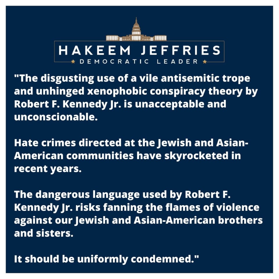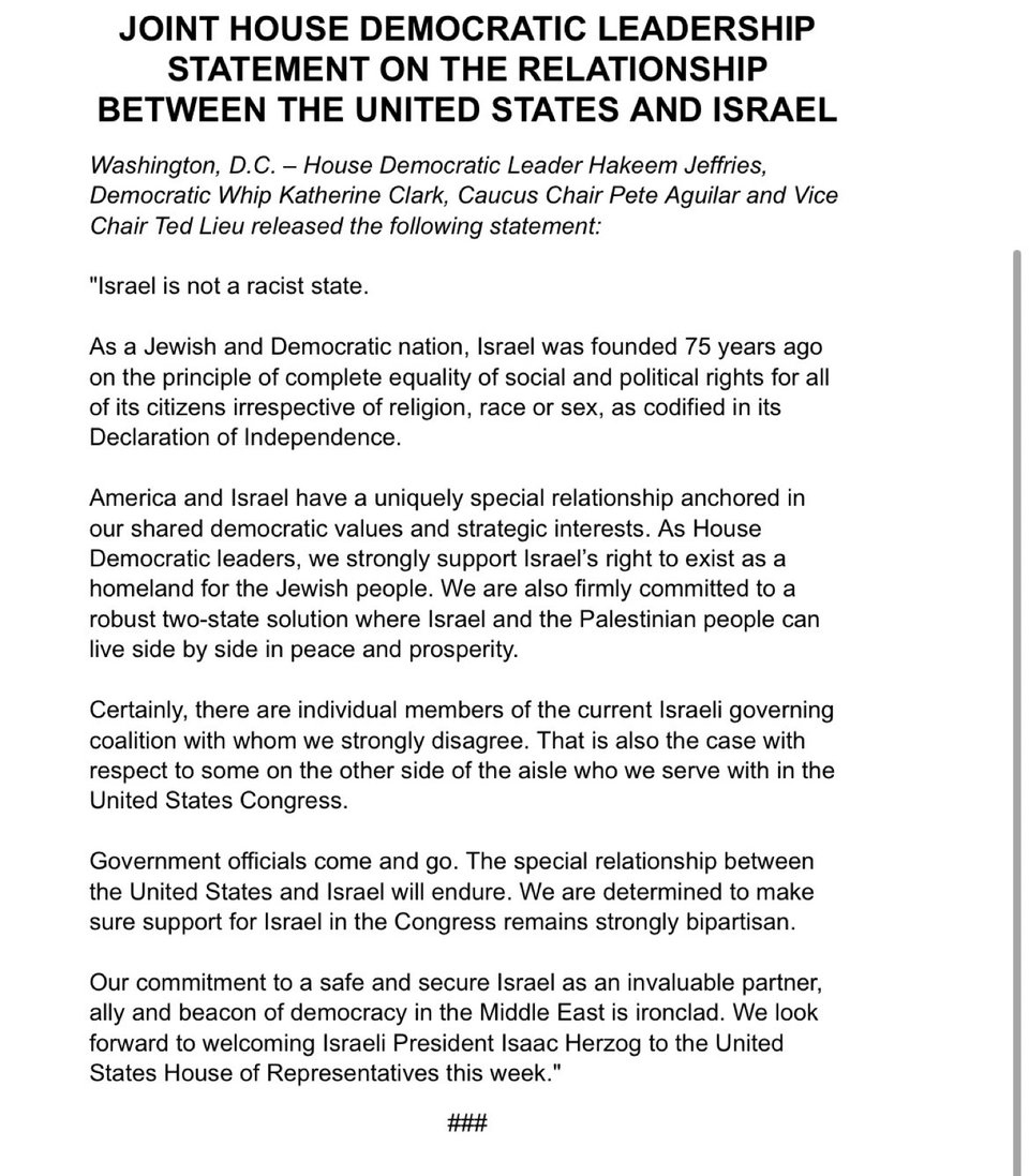 Now Hakeem Jeffries and his leadership team issue a statement: “Israel is not a racist state.” pic.twitter.com/w4rPljxQG3