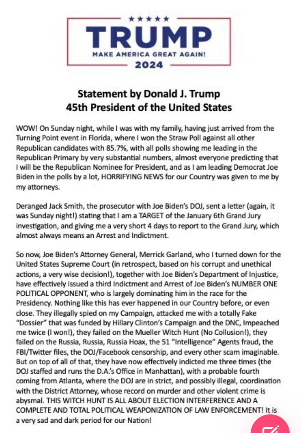 Trump disclosed the existence of a target letter in a post on his Truth Social platform, saying he received it Sunday night and that he anticipates being indicted. Such a letter often precedes an indictment and is used to advise individuals under investigation that prosecutors have gathered evidence linking them to a crime; Trump himself received one soon before being charged last month in a separate investigation into the illegal retention of classified documents.