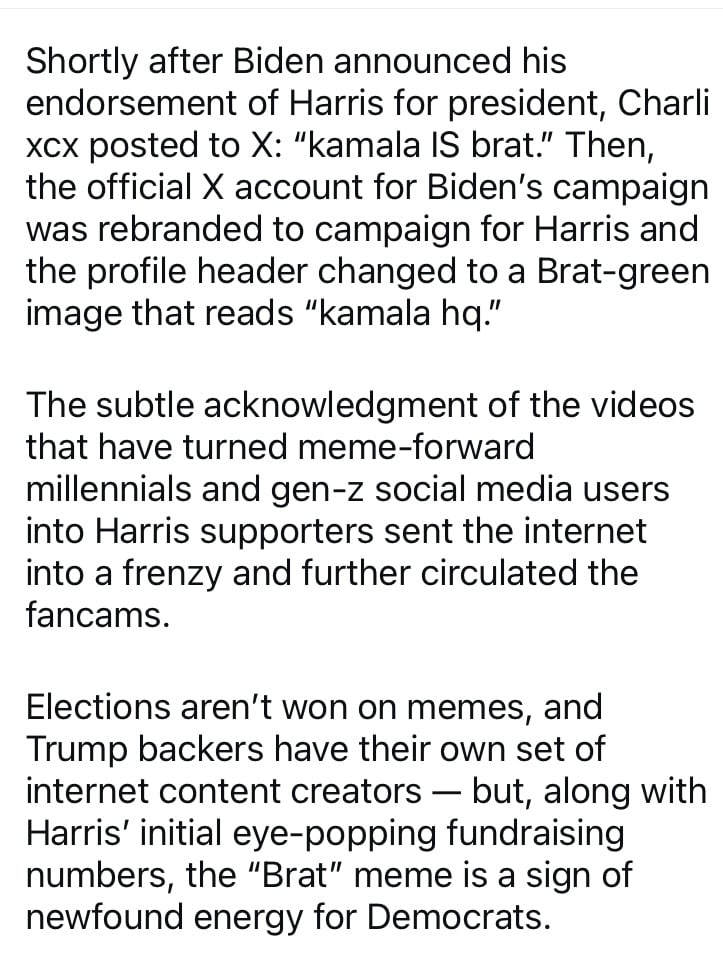 Are you now a BRAT expert? KAMALA is BRAT helps get GEN-Z to the ballot box, where GEN-Z will pummel Donald Trump. Smile.