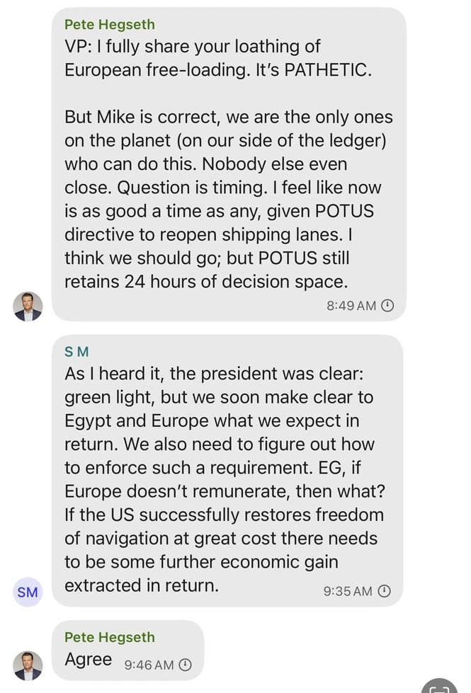 The user identified as Hegseth responded three minutes later: “VP: I fully share your loathing of European free-loading. It’s PATHETIC. But Mike is correct, we are the only ones on the planet (on our side of the ledger) who can do this. Nobody else even close. Question is timing. I feel like now is as good a time as any, given POTUS directive to reopen shipping lanes. I think we should go; but POTUS still retains 24 hours of decision space.”