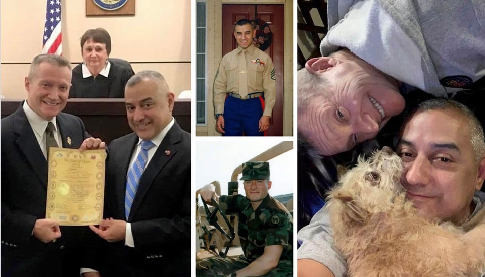 Danny Ingram and Eric Alva, in blue tie, were married in 2017, left, after the two veterans met in 2010 while lobbying Congress to repeal ‘Don’t Ask, Don’t Tell.’ They now live in San Antonio with their dog, Sandy.
