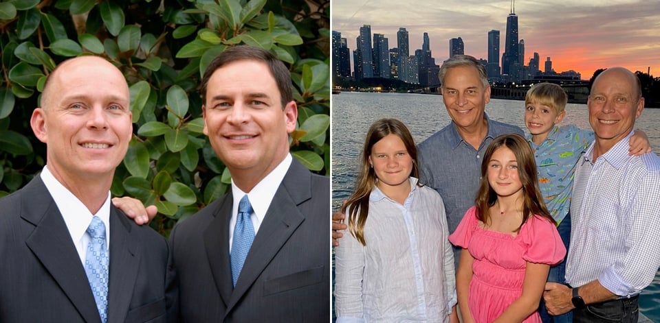 Rick Olson, far left, and Jay Timmons at their wedding in 2008 and with their family during a recent trip to Chicago.