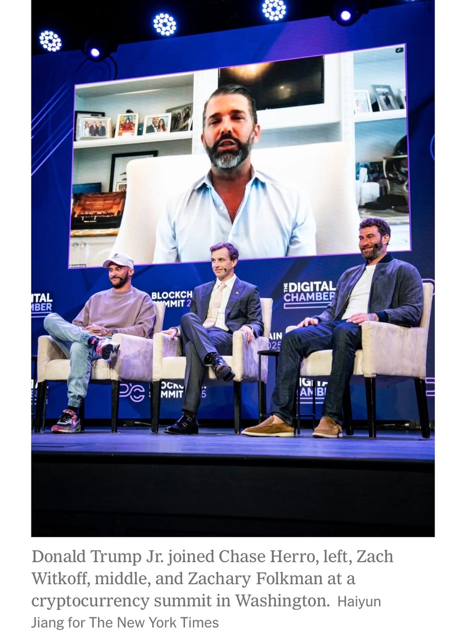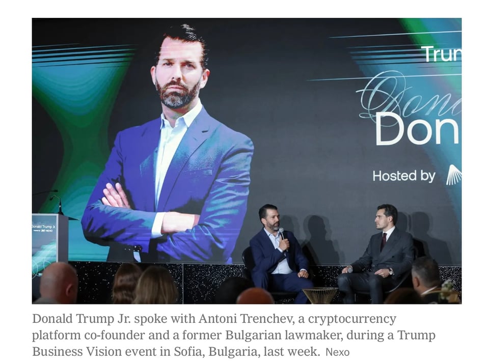 Donald Trump Jr. then moved on to Bulgaria, where he appeared on a stage along with Antoni Trenchev, the co-founder of a cryptocurrency firm called Nexo that was fined $45 million by the S.E.C. in 2023 and agreed to leave the U.S. marketplace.