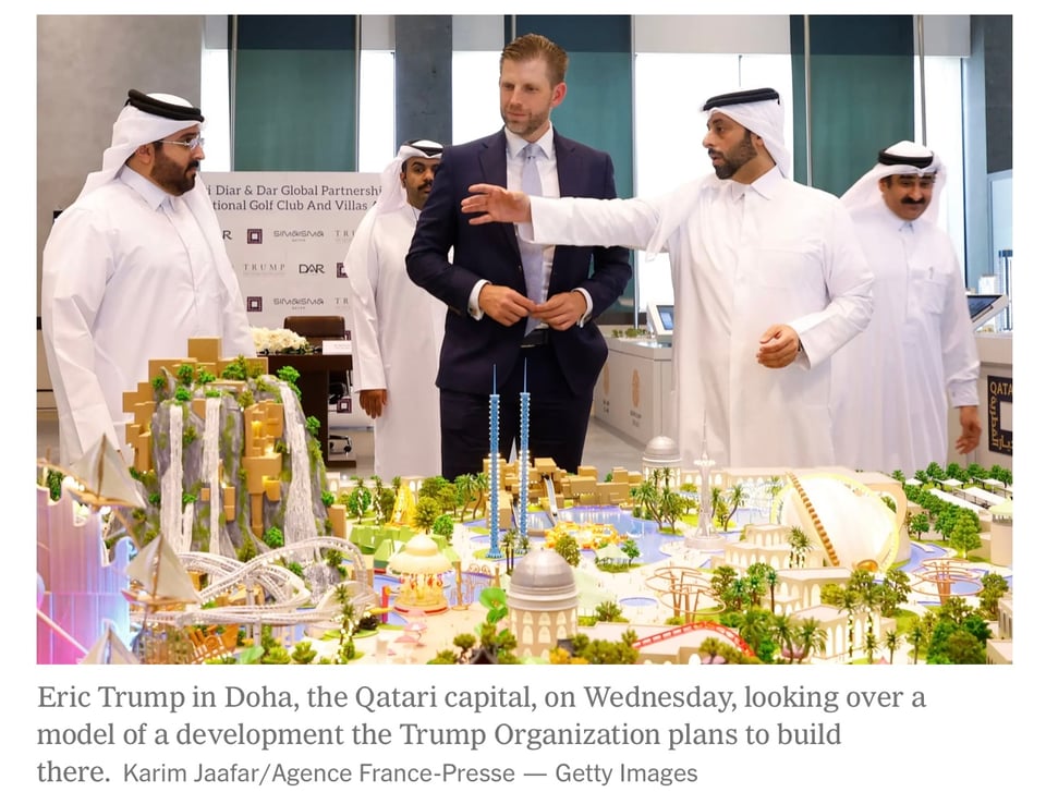 Eric Trump flew to Doha, the capital of the tiny Middle East nation of Qatar, on Wednesday as a government official there signed a deal with a Saudi-based real estate company to build a new Trump golf course and luxury villa complex, a partnership that will bring millions of dollars in branding and management fees to the Trump family.
