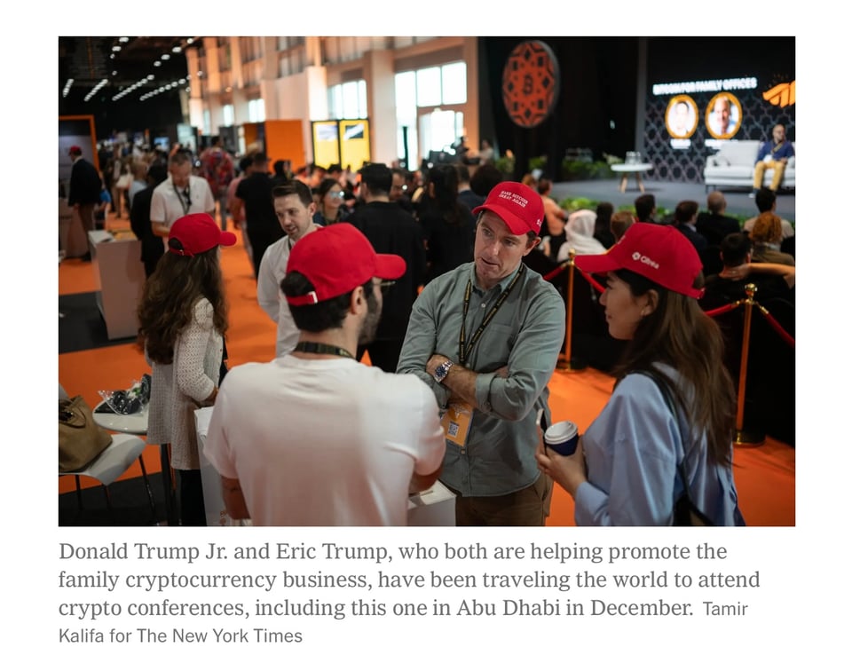 On a crypto conference panel in Dubai, Eric Trump sat next to Zach Witkoff, one of the founders of the Trump family crypto firm, World Liberty Financial, who announced that a venture capital firm backed by the government of Abu Dhabi would invest $2 billion using a form of digital currency offered by World Liberty. This deal alone could generate hundreds of millions of dollars in revenue for the Trump family and its partners.