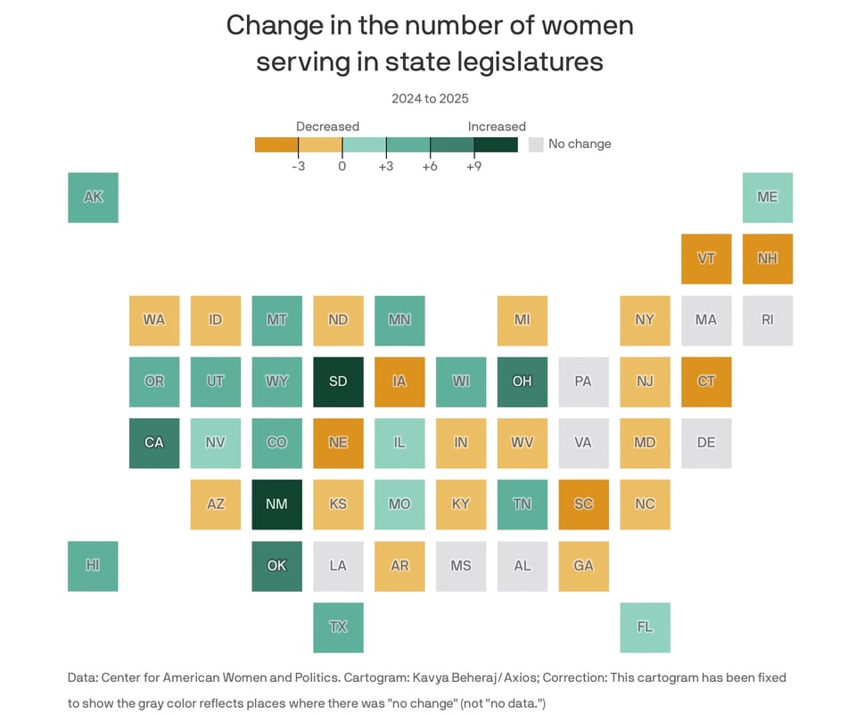 Yes, but: The uptick was small. And at least 13 states saw losses in female representation. (Axios).