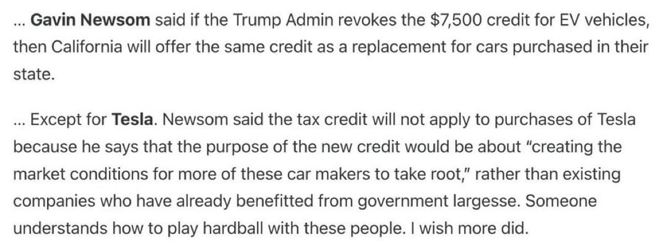Trump plans to end tax credits for Electric Vehicles. Gavin Newsom gives a tax credit to Electric Vehicles in California (except Teslas… tee hee).