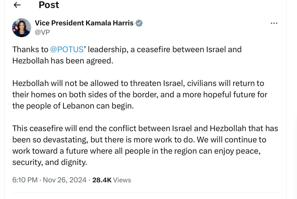 Biden: Under the deal reached today effective at 4:00 A.M. tomorrow local time, the fighting across the Israel Lebanon border will end and it is designed to be a permanent cessation of hostilities.