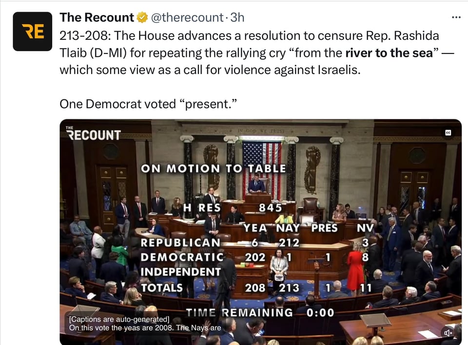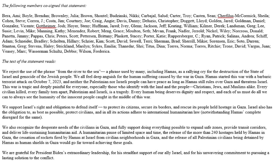 “From the river to the sea” which was used by Congresswoman Tlaib (on her video denouncing President Biden) is broadly recognized in the Congress as a rallying cry Hamas embraced, urging the destruction of Israel and the Jewish people.