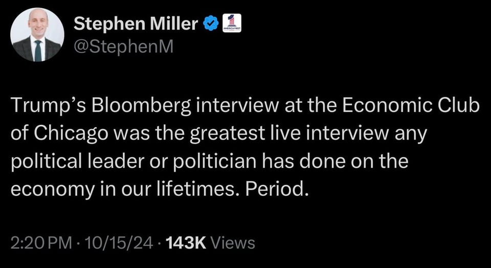 Were Trump’s consiglieres watching the Bloomberg interview? Did it lead Miller and Cheung to post these👇 to lift dear Leader’s spirits?