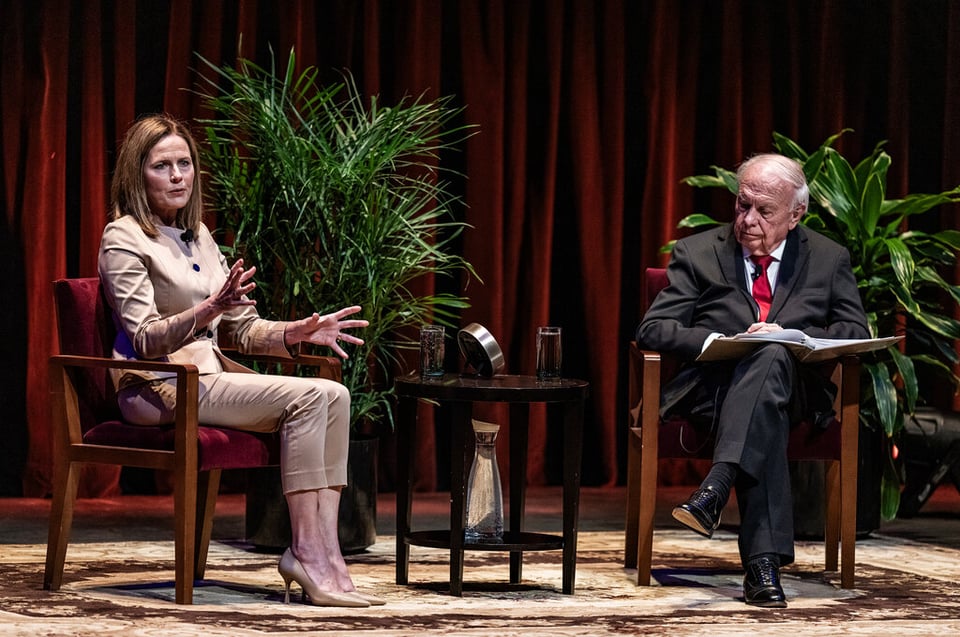 Justice Amy Coney Barrett spoke on Monday at the University of Minnesota Law School with Robert Stein, law professor and the former chief operating officer of the American Bar Association.