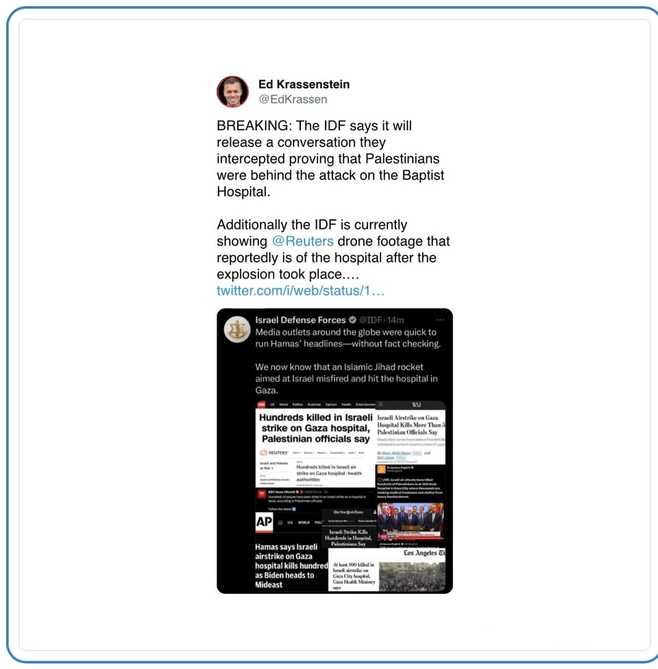 Israel and Hamas each blamed the other side for the blast which killed hundreds of people in a hospital in Gaza. Hamas blamed an Israeli airstrike, while the Israeli military [the IDF] said the hospital was hit by a rocket misfired by Palestinian militants [Palestinian Islamic Jihad].