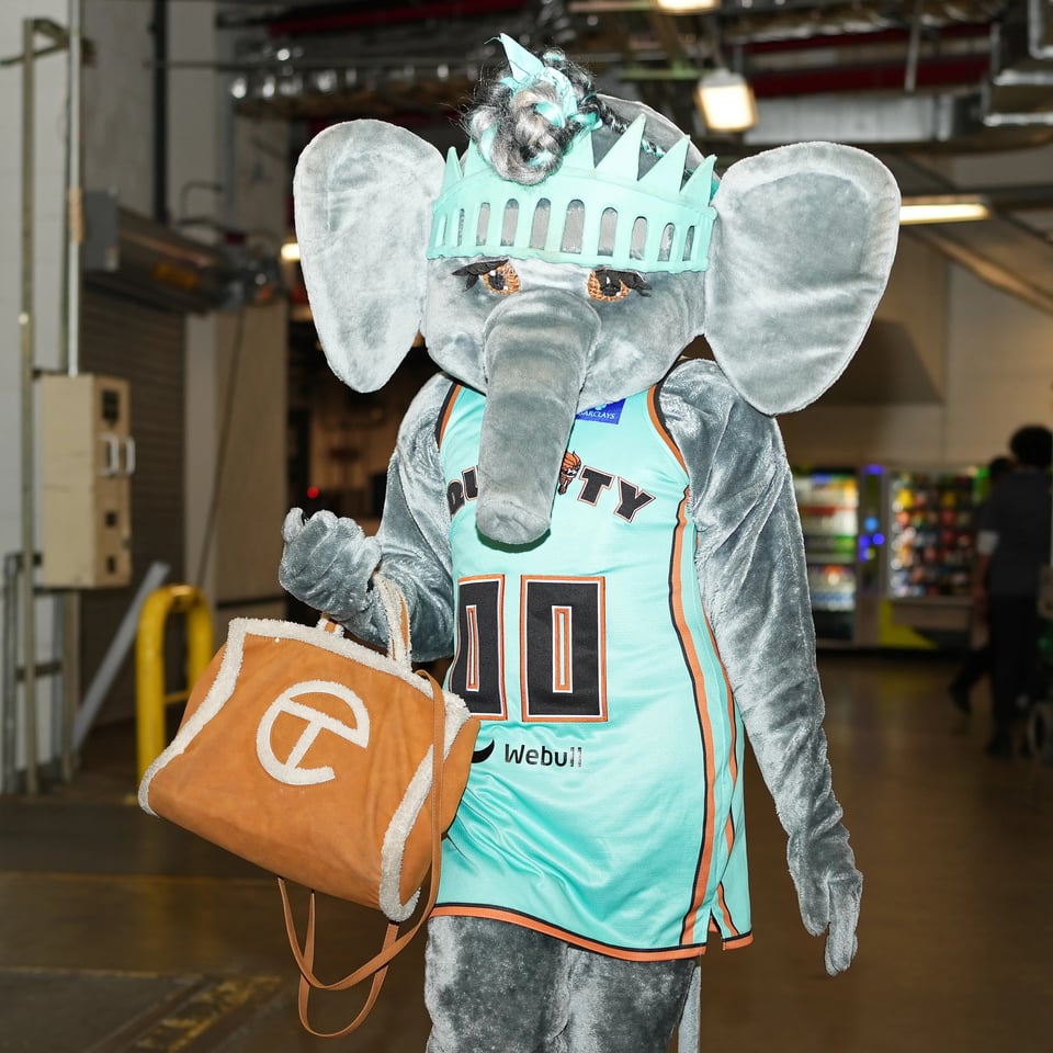 While tunnel walks have become something of a fashion show for players to flaunt their style off the court, Ellie is her own kind of scene-stealer. The anthropomorphized elephant with a growing TikTok fanbase was always dressed for the halftime show, boasting a turquoise Liberty jersey from Rare Breed BX, Statue of Liberty crown, and a long, multicolored braid that she likes to whip around.