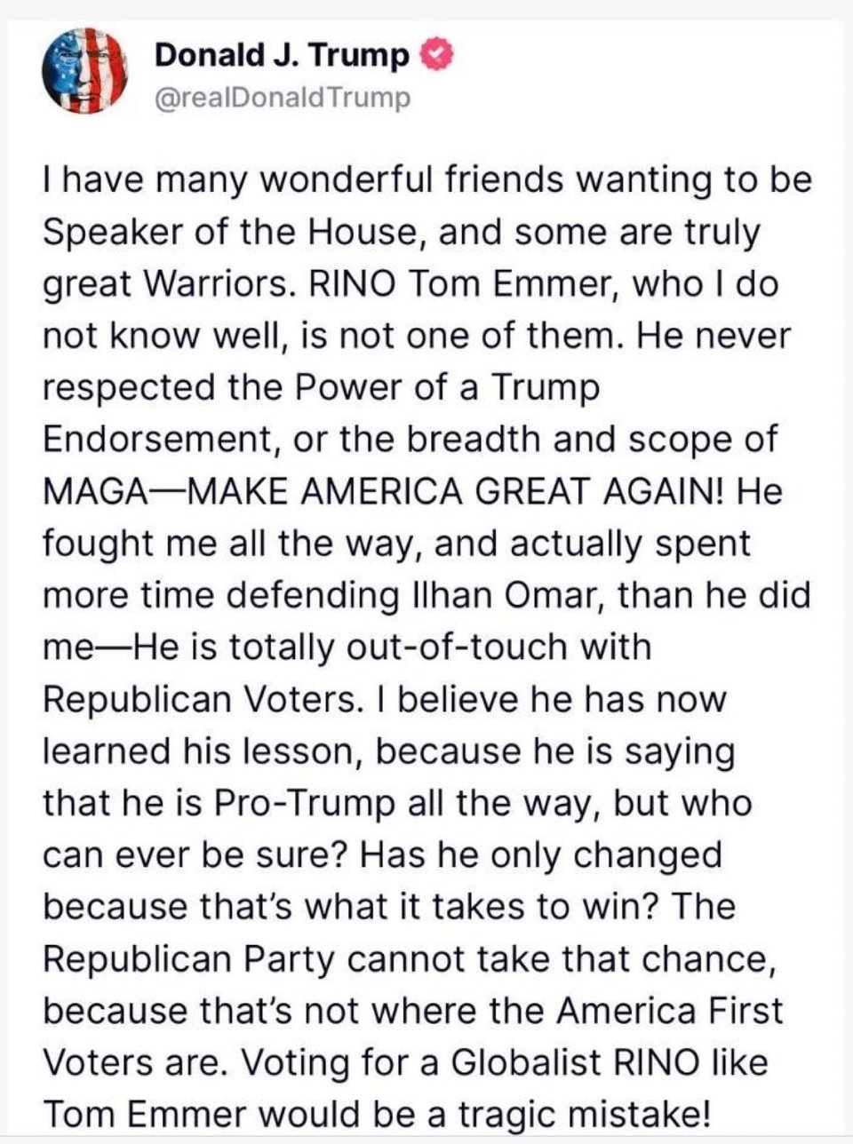 But no sooner did Emmer win the majority vote of his colleagues than his nomination was shot down by a powerful detractor he had tried to win over — Trump, who has long criticized the party’s former campaign chief as disloyal.