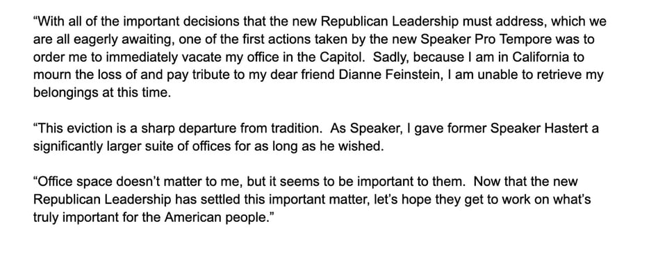 As one of his first acts as the acting speaker, Rep. Patrick McHenry ordered former Speaker Nancy Pelosi to vacate her Capitol hideaway office by Wednesday.