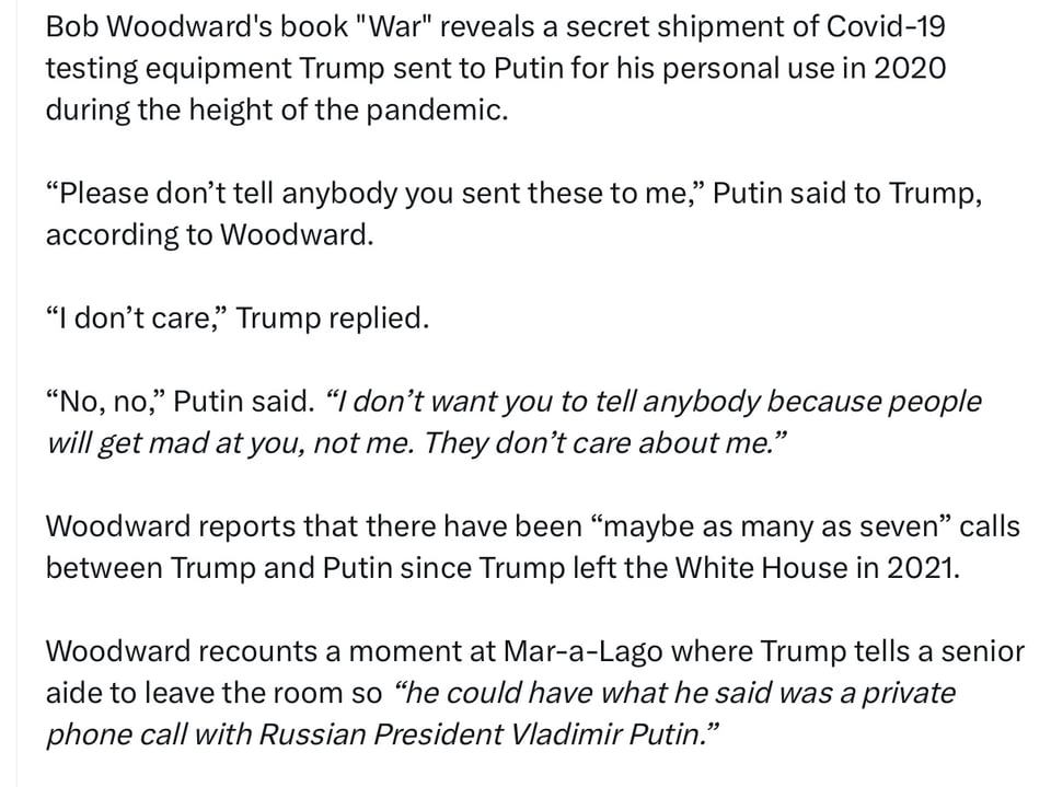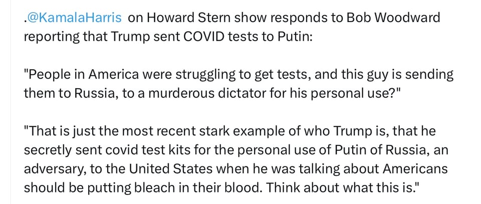 New York Times - Kamala Harris just spoke at length about a report in a new book by the journalist Bob Woodward, which detailed Donald Trump’s friendly relations with President Vladimir Putin of Russia. Woodward reported that Trump sent Putin Covid tests in 2020. “People were dying by the hundreds,” Harris said. “Everybody was scrambling to get these kits,” adding that “this guy who is president of the United States is sending them to Russia, to a murderous dictator, for his personal use.”