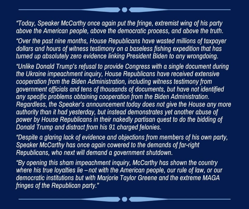 The illegitimate impeachment inquiry launched by Extreme MAGA Republicans is regrettable, reckless and reprehensible.