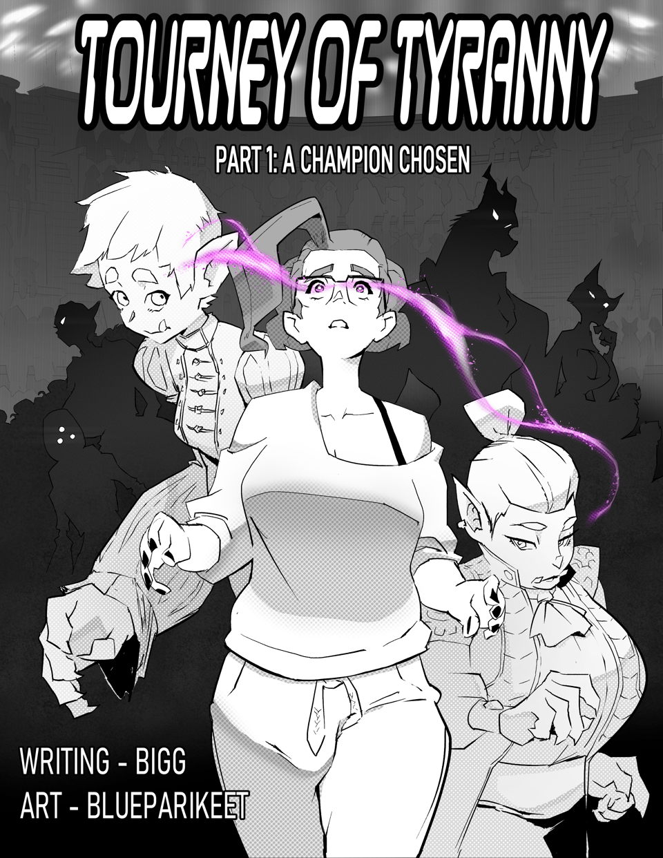 Tourney of Tyranny is a pornographic illustrated light novel (written by BP Game's Bigg, with art by Blueparikeet) about LILITH LACRIMOSA, a schlubby, lonely failwoman working a dead-end job whose life is turned upside-the-fuck-down when a pair of goblin-like aliens show up and pressgang her into becoming their race's champion in a tournament for galactic dominion! The catch: the tournament is all about sex, and to give their champion an edge, the Goblinoids have secretly given Lilith's powers of persuasion a significant upgrade...