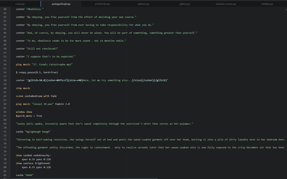 As implied by the title of this e-mail, my work this month has involved taking a break from writing script (in GDocs) to writing script (in Ren’Py). Programming is not really the sexiest topic (unless you’re a REAL pervert) but there IS a lot of it to do and there’s simply no getting around it - especially with Monstrous Liberation, with which I’m making a concerted effort to make noticeably jazzier presentation-wise than Opportunity. (Opportunity was, feature-wise, about as bare-bones a kinetic novel as it’s possible to produce so you might be inclined to retort “well that shouldn’t take much” but I promise I’m also trying to make it look slick by some kind of objective standard.)