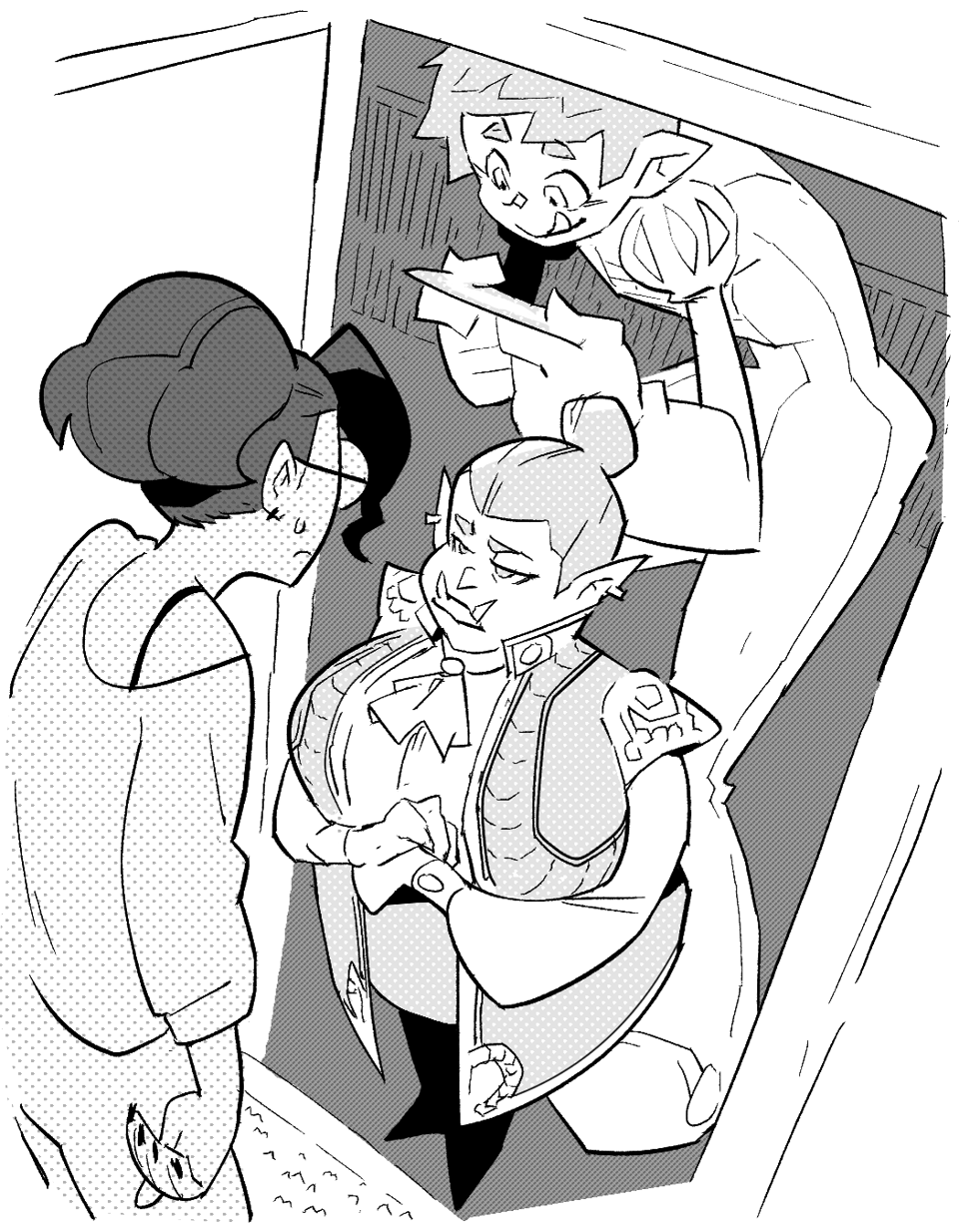 This rude (and accurate) assessment of Lilith’s door-opening had come from a squat, primly-dressed woman who looked to be almost half Lilith’s height. Behind her was another woman, this one younger, slender, nervous, dressed in… Lilith wasn’t sure. Some kind of bodysuit? Both were green and had tusks.