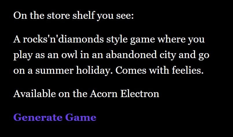 Need some inspiration? Feeling nostalgic for an era you don’t even remember yourself? Try out Michael Klamerus’ British Game Generator. I’ve included my own favourite British Game in the screenshot, feel free to send us any other gems it comes up with. FSN