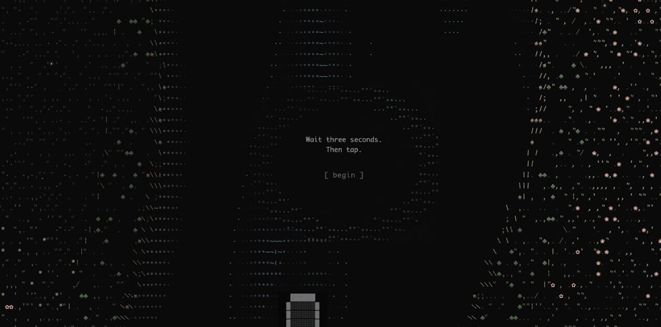 River of Reverence is what creator Tim Holman calls a “patience toy.” A river of ASCII symbols and ambient music flows in and out, and you are instructed to do that one, excruciatingly important thing: wait. FSN