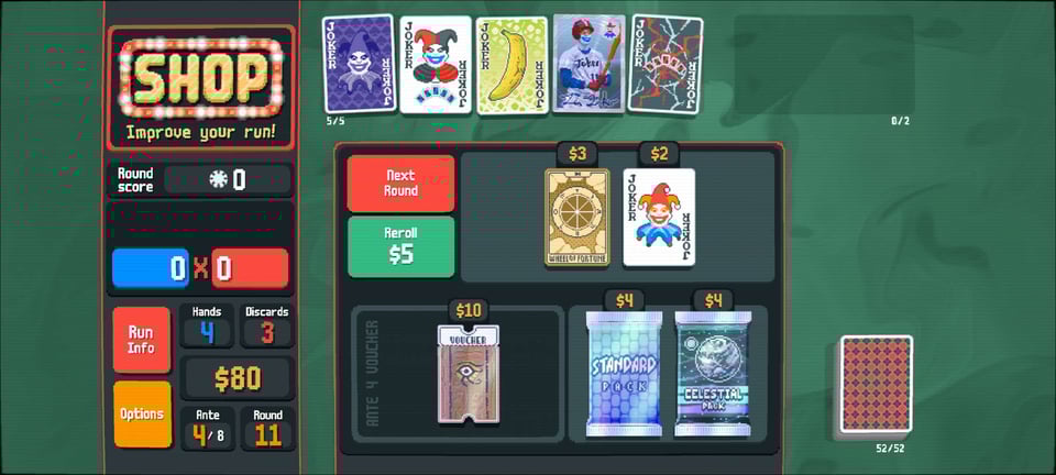 In actuality, on my first go I ended up stopping before getting a full five card reading. It’s up to chance whether a singular Tarot card appears in the shop after each round, and even though I reached ante 10 I still had only seen four Tarot cards! So I tried again. The second time it worked out, so I’ll share the full reading here: