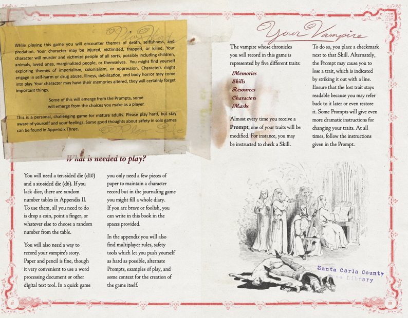 If you have any interest in solo TTRPGs, you will have likely already heard of Tim Hutching’s Thousand Year Old Vampire. The game has you answering prompts to chart out the long life of an immortal being. Chris mentions the freedom to forget in his piece, and I particularly like how Thousand Year Old Vampire forces you to choose between memories to lose as you progress through your lifespan. FSN