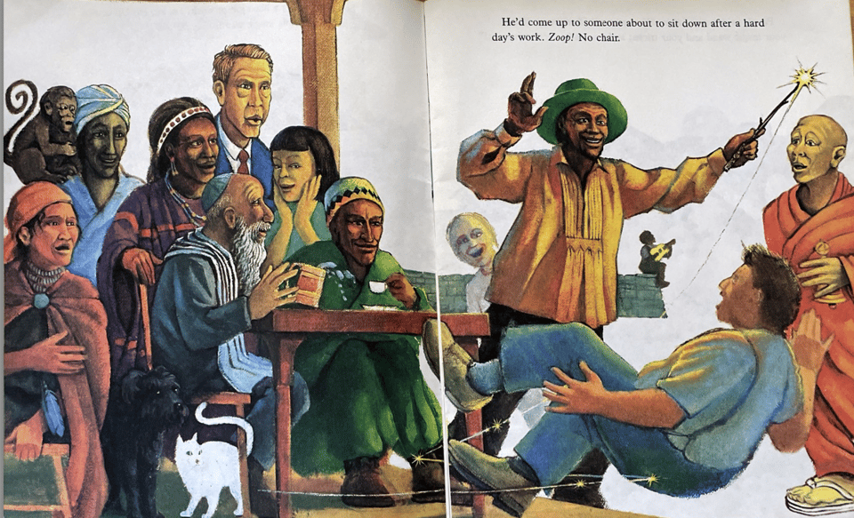 The book starts by introducing a village and the village nuisances — a ukulele-clanking young boy and his prankster magician father. They annoy the villagers, who wear a rainbow of traditional outfits and represent many races and ethnicities.