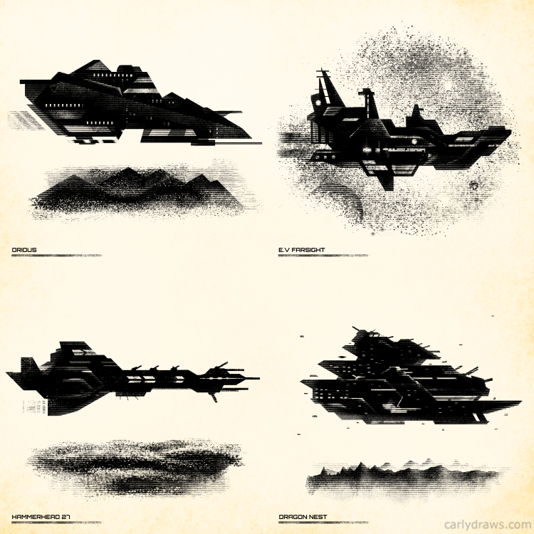 I've also been experimenting with some ttrpg art of my own, making these layered sci fi spaceships and scenes inspired by interlaced screens and grotty sci fi books. Prints are available in my inprnt shop, or if you'd like to use them in your own ttrpg project, there are whole fleet of them available as an art pack at itch.io