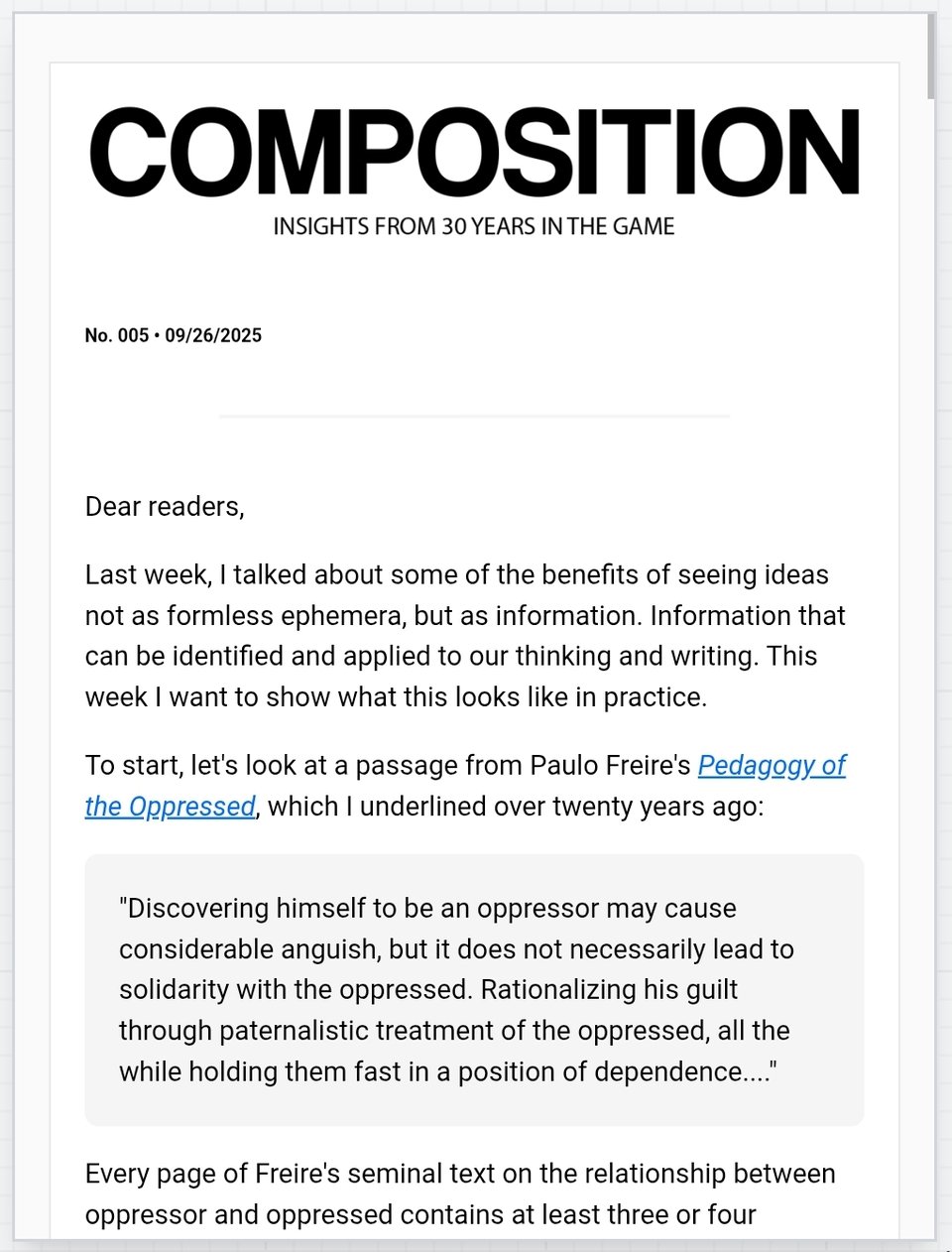 My job? To pack COMPOSITION emails, not only with hot takes on the most recent knowledge work discourse, but with actionable insights on what it takes to help you become a prolific writer who, unlike the vast majority of other writers, maybe even makes some money.