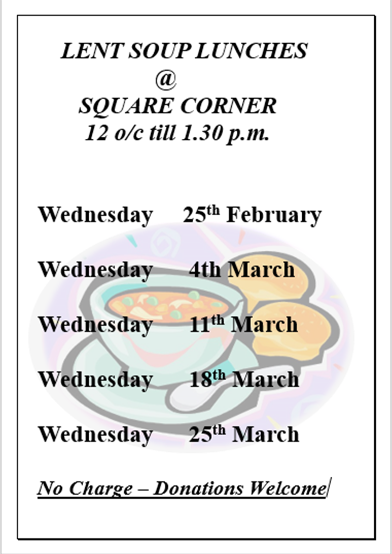 12noon – 1.30pm Lent Soup Lunch - Square Corner Uffculme – see details below