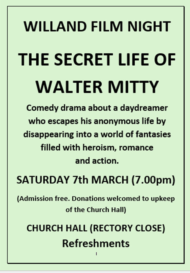 7pm Willand Film Night (The Secret Life of Walter Mitty) Willand Church Hall - see details below