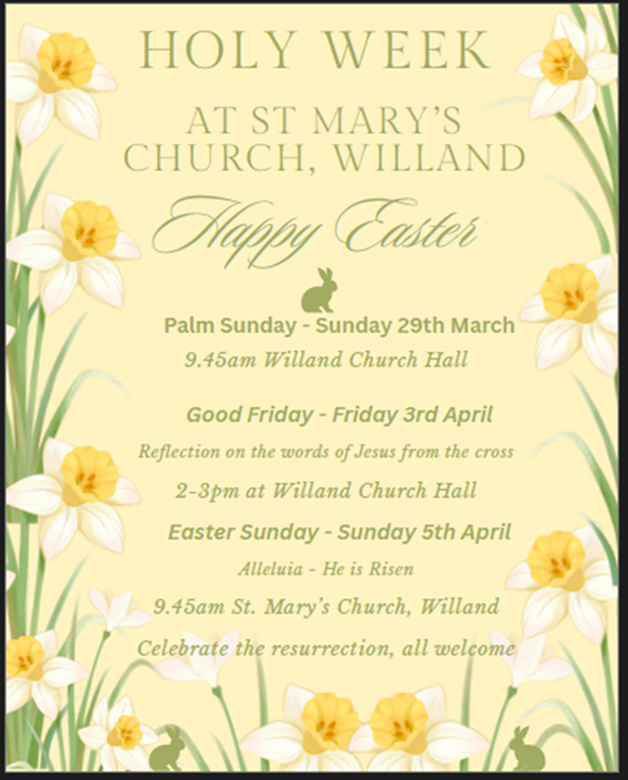 Maundy Thursday 2nd April @ 7pm There will be an Agape Feast and reflection in Willand Church Hall (Ag a pe Feast: A communal meal shared in the early Christian church symbolizing fellowship and unity. Bread and ‘wine’ will be served)