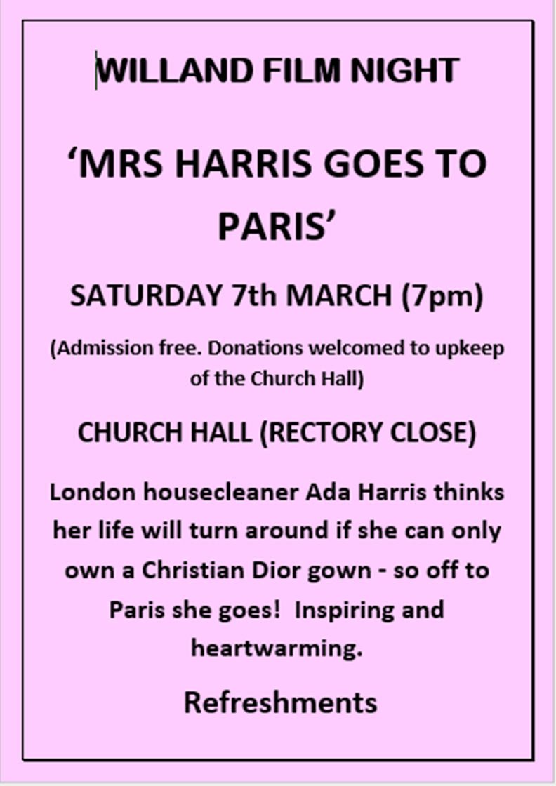 Ladies of Willand meet for a meal and a social time together at a local hostelry, on Friday 20th March, at 6.30pm. If you would like to join them, just email Chris Dodds at doddsy4203@gmail.com, so you can be sent the menu. All ladies welcome, from wherever, Church members or not.