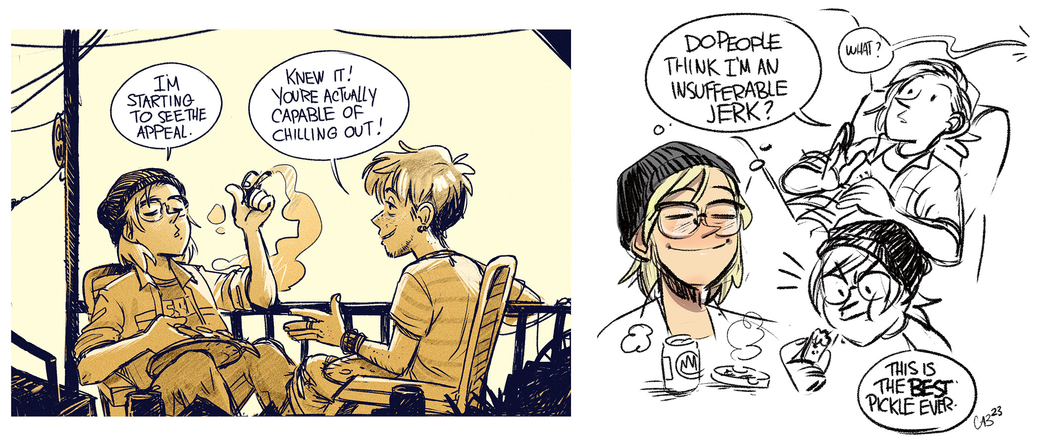 Chaque année je fais un dessin twit pour le 4/20 parce que je suis une adulte responsable. Plutôt que de dessiner Sam, le roi des stoners fictifs, j’ai pensé que ce serait drôle d’imaginer Étienne qui commence à prendre goût au mode de vie plus relaxe de Utown. Et sur une note plus “sérieuse”, ça fait un an que 420 Grammes, l’essai de Philippe Meilleur que j’ai illustré, est sorti. Je l’ai relu et c’est encore très, très drôle.