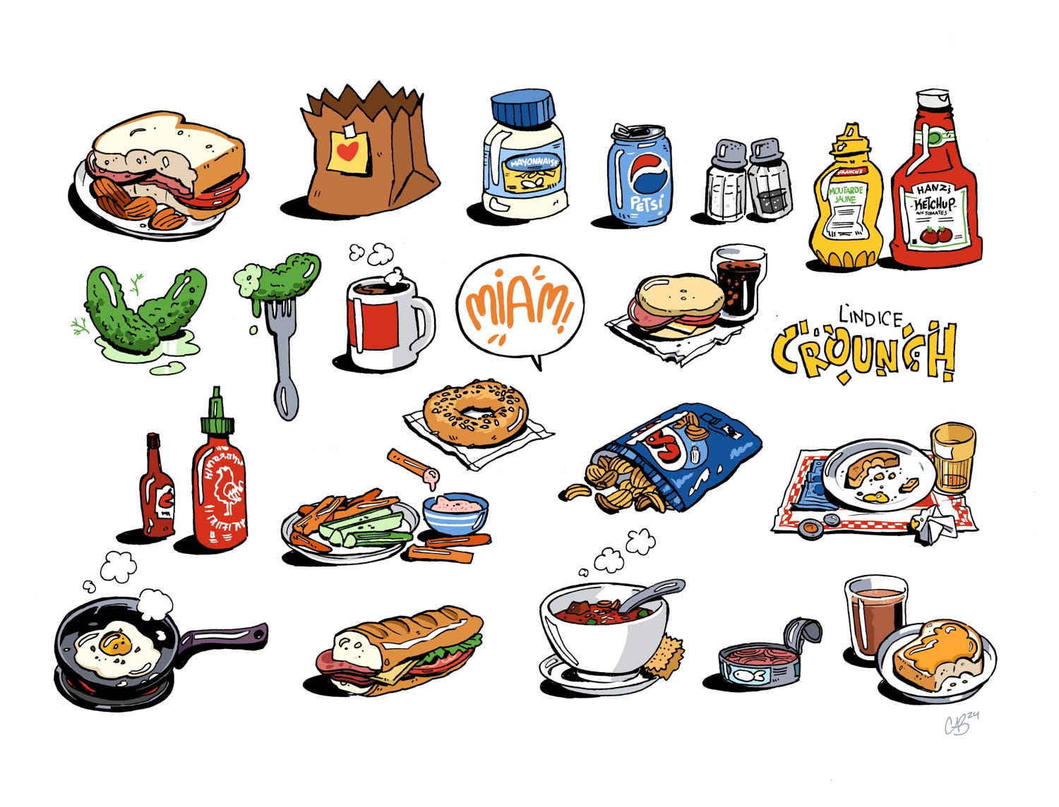 Le découpage des sandwichs - je veux dire, le découpage graphique de L’heure du lunch - avance rondement. C’est une étape assez fastidieuse, entre la scénarisation, le storyboard et la mise en page, mais je commence à pogner la twist. En parallèle, j’ai fait un paquet de tests de rendus de bouffe en couleur et j’ai décidé d’utiliser le résultat pour refaire l’habillage de ma page Patreon. C’est un style vraiment simple mais c’est aussi étonnamment appétissant, qu’on m’a dit. Je vous laisse en juger!