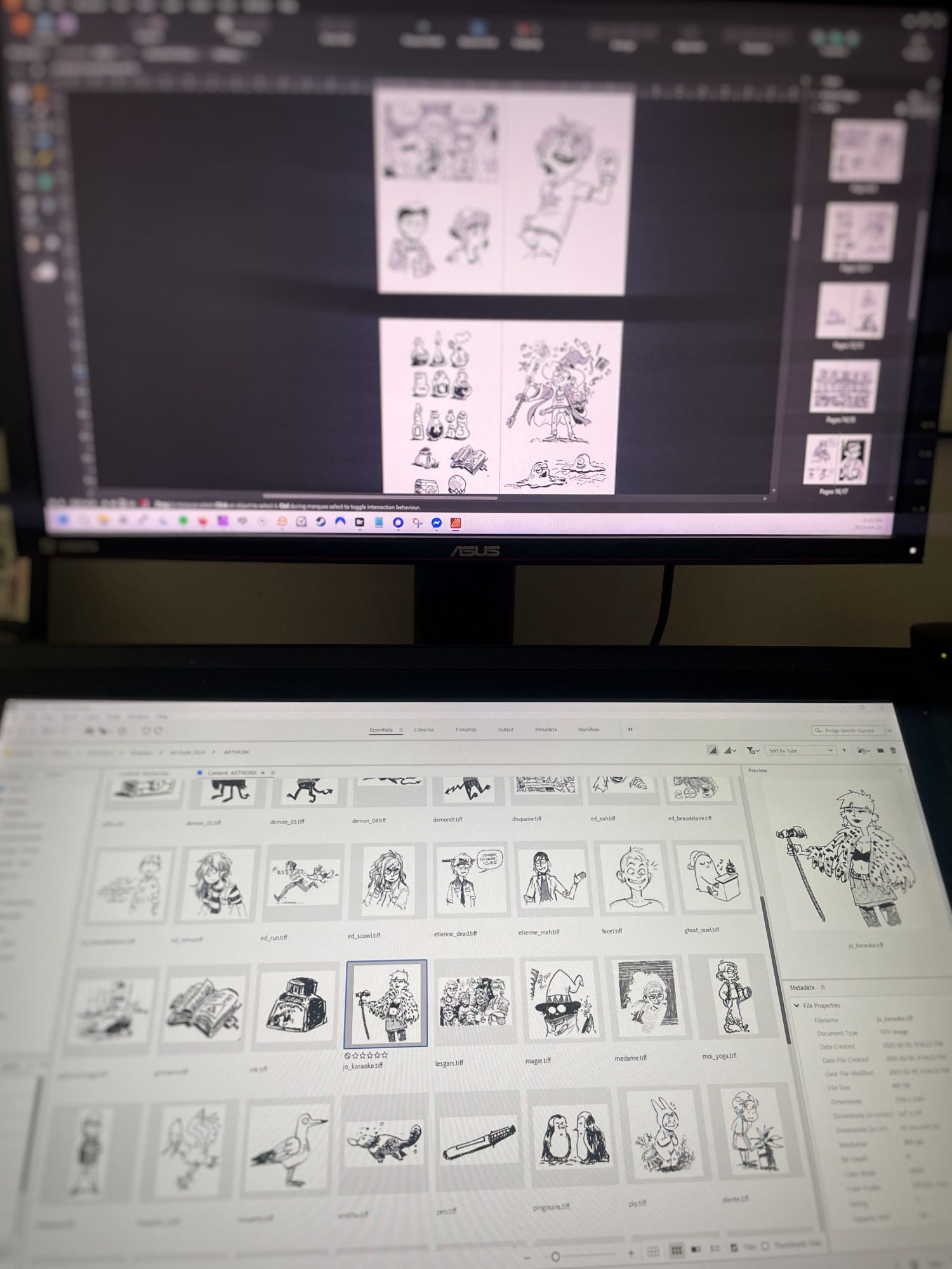 Entre divers contrats et obligations, je sprint le montage de mon artbook, dont le titre de travail est Plumage, en référence à la quantité de doodles d’oiseaux qu’il contient. C’est aussi un petit clin d’oeil à la plume, mon outil de travail préféré. Il me reste juste une couple de trucs à scanner, une couverture à faire et un dépôt légal... Avant le 10 mai, de préférence! Whew…!