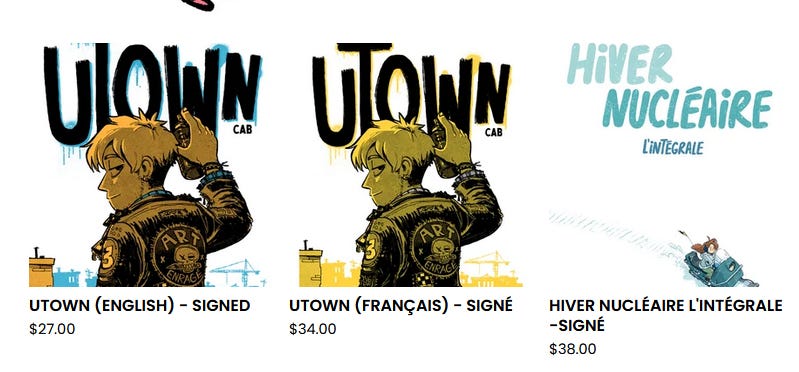 Grosse, grosse nouveauté dans ma boutique: j’ai mis des livres dédicacés et signés en vente! Il est maintenant possible de vous procurer l’intégrale d’Hiver Nucléaire, Utown en français et en anglais, dédicacés. Vous n’avez qu’à m’indiquer le nom de la personne à qui le livre sera dédicacé dans une note au moment de l’achat et je me charge du du reste! En cas de doute, je ferai une dédicace neutre/ouverte. Tout est encore en rodage, donc je ne shippe qu’au Canada et aux États-Unis pour le moment. Si vous le souhaitez, il sera possible de venir les ramasser chez nous, à Montréal et sauver sur le shipping avec le code PICKUPBOOKS.