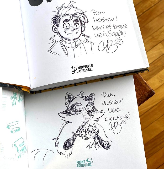 À travers le chaos de toute ça, j’ai passé le mois de janvier à organiser mon séjour à Angoulême, petite ville française qui accueille un gigantesque festival de BD depuis 51 ans. Le 23 janvier, on s’envolait moi, mes éditeurs et collègues chez Front Froid/Nouvelle Adresse et 60 auteurs canadiens, vers la France. Et quelle aventure ce fût, mes amis; imaginez des tentes grosses comme des Walmart pleines d’auteurs, de maisons d’édition et surtout, DE MONDE! 200 000 personnes envahissent la ville en l’espace de quatre jours; une chance je suis pas agoraphobe. J’ai trippé ma vie, j’ai vu pleins d’expositions, dont une sur la bouffe en BD (approprié), j’ai mangé 50 livres de fromage et de pain, j’ai rencontré un paquet d’auteurs, dont Zerocalcare (!!!), j’ai rit, j’ai été émue en voyant des planches originales de Franquin, Goscinny, Morris, Peyo, Hergé et j’ai monté et descendu beaucoup, beaucoup de pentes. Ce fût une expérience inoubliable et je me sens incroyablement privilégiée d’avoir pu assister au Festival d’Angoulême une fois dans ma vie, avec une si grande délégation canadienne. C’était ouf en esti.