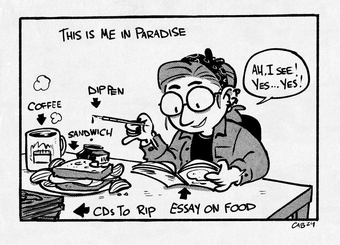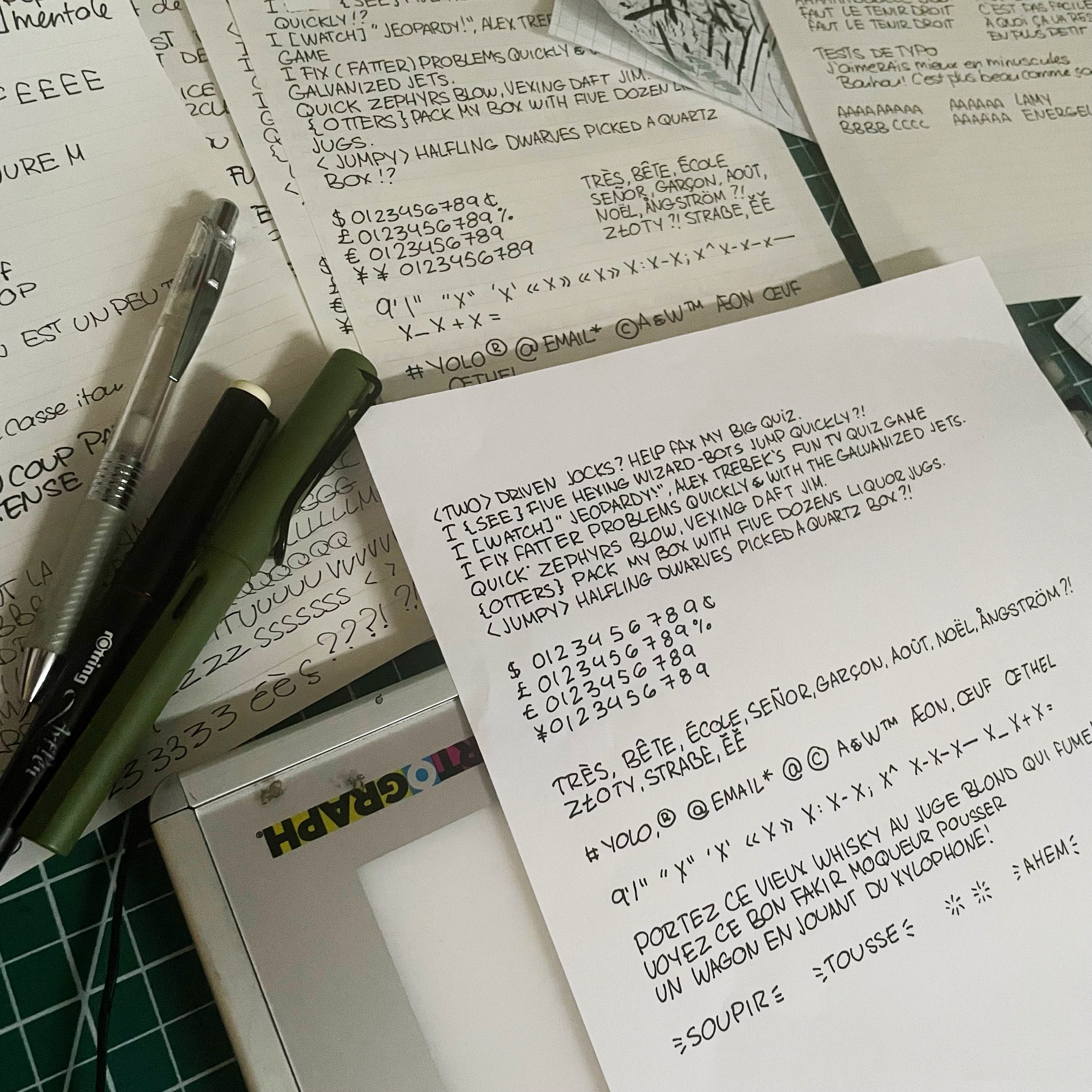 Après des années à utiliser des fonts de comic books américains pour le lettrage de mes bds, j’ai décidé de faire faire une typographie basée sur ma propre écriture à la main. C’est le cartoonist canadien John Martz qui s’en est chargé. J’ai toujours été très complexée par ma calligraphie et j’ai passé pas mal de temps à faire des tests avec divers outils afin de produire une police de caractères qui allait bien s’incorporer à mon dessin. Un vrai exercice de moine copiste! Je suis vraiment contente du résultat et j’ai hâte d’introduire le Cab Sans dans mes futurs livres! Si ça vous intéresse, je parle du processus plus en détail sur Patreon.