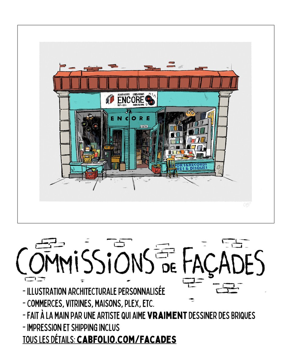 Comme je disais le mois passé, j’ai un historique de dessiner des façades pour le fun. J’ai donc décidé de tenter l’expérience d’ouvrir une quantité limitée de “commissions” d’illustrations de façades. Maisons, commerces, plex, je suis ouverte à toutes sortes de commandes! Il n’y a que quatre spots d’ouverts pour le moment, donc rendez-vous sur cette page pour avoir les prix, les infos et comment me contacter.